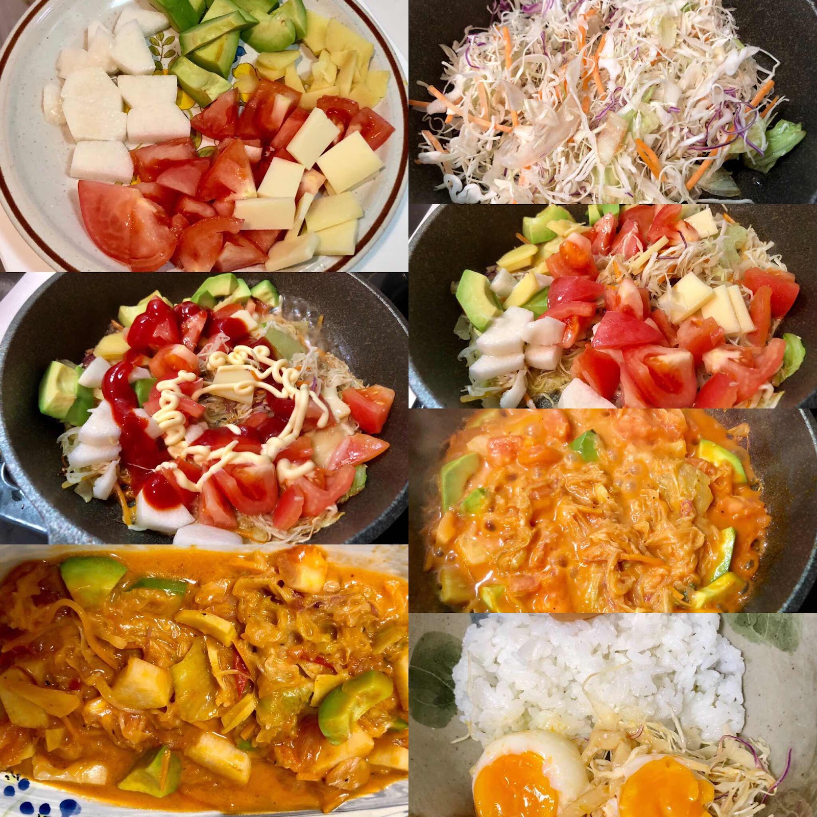 キャベツ、レタス、トマト、アボカド、生姜、山芋の材料を、チーズ、オリーブ油、ごま油、塩黒胡椒、本みりんと日本酒で炒め、仕上げにケチャップとマヨネーズで仕上げ、超美味しいイタリアン風野菜炒め出来ました❣️