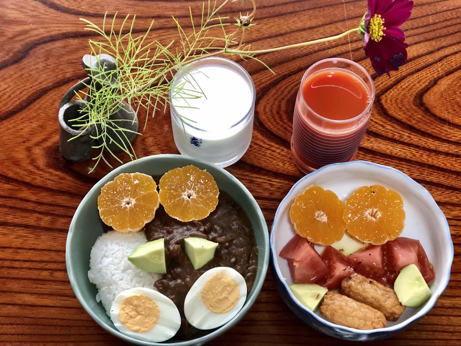 お祝いの朝食にと言うことで、カレーにもサラダにもみかんを横切りして、菊模様にしました❣️