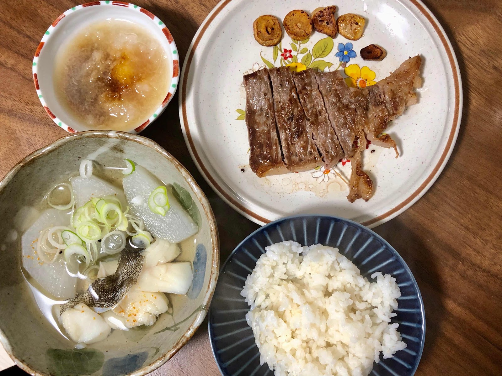 今夜は宮崎産黒毛和牛のサーロインステーキ買いましたので自宅で焼きました‼️塩胡椒だけのシンプル焼きで大根おろしでいただきました。バランス考えて、真鱈と大根の煮物も作りました☺️美味しく食べれることに感謝です☺️