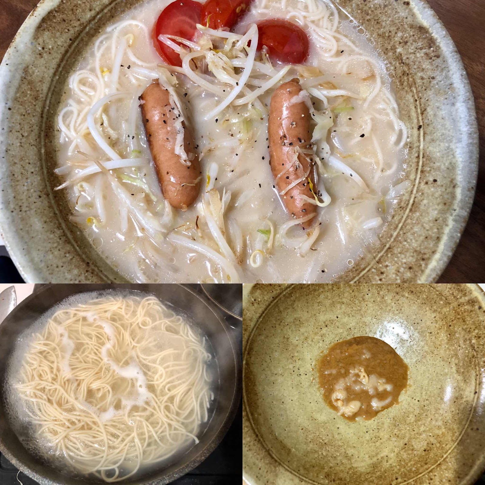野菜たっぷり(もやし、キャベツ、トマト🍅)で作りました。博多長浜ラーメン、豚骨スープ美味しいです☺️