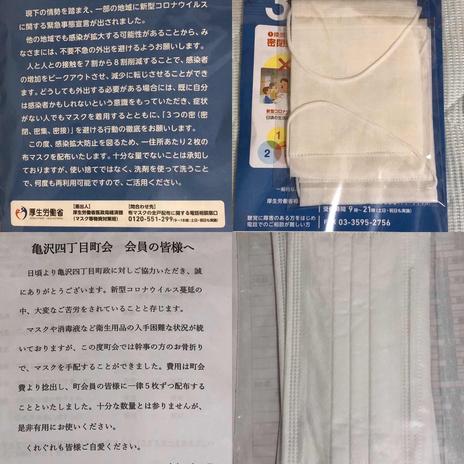 先日、厚生労働省から布マスク2枚が届きましたまた郵便受けにマスクが入っていましたので重複配布かと思いました。結果、この町内会から不織布のマスク5枚の配布でした!