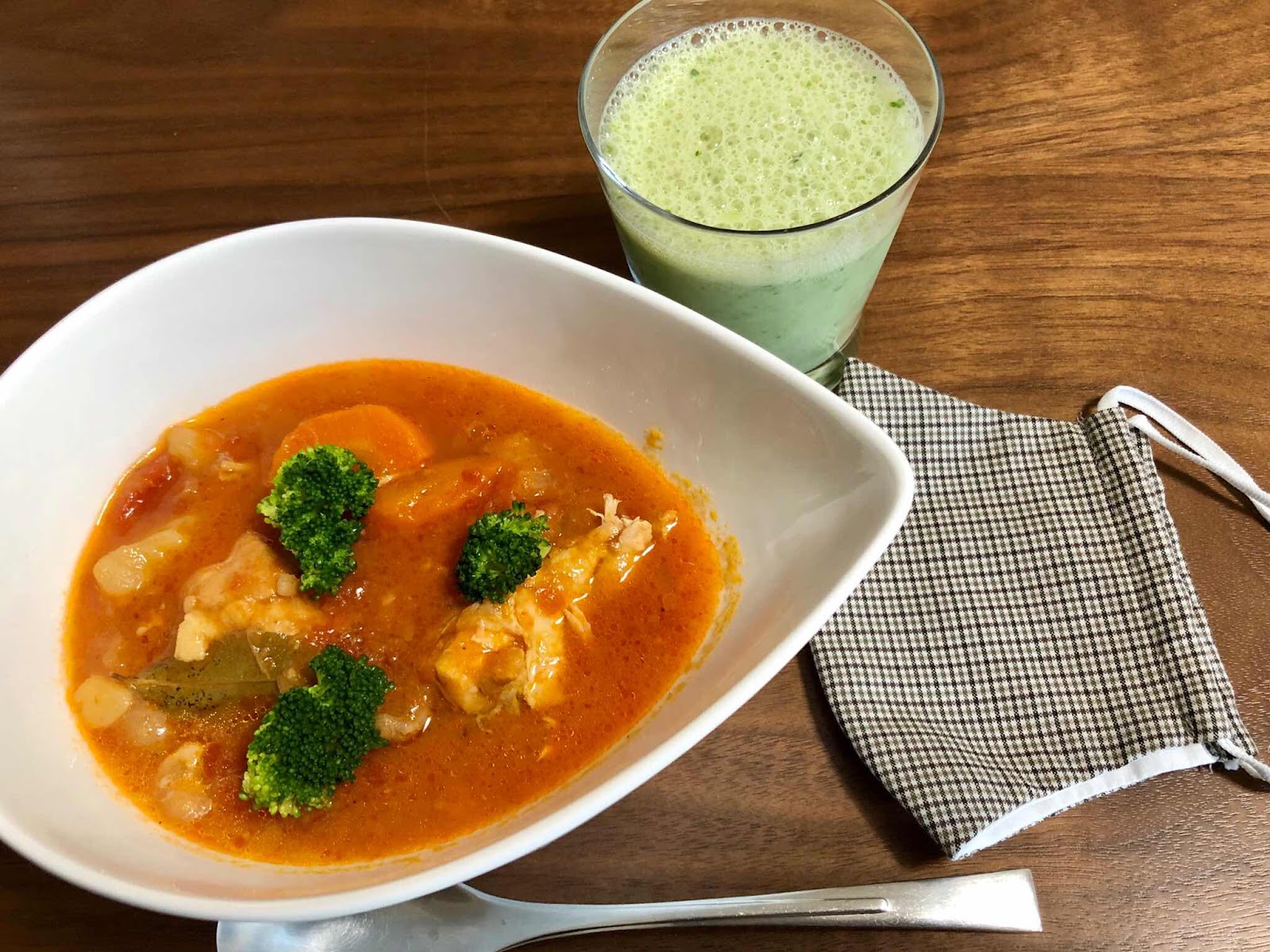 朝食は昨夜の残りの鳥もものトマト煮と小松菜とバナナのスムージー、ヘルシー朝食です😊