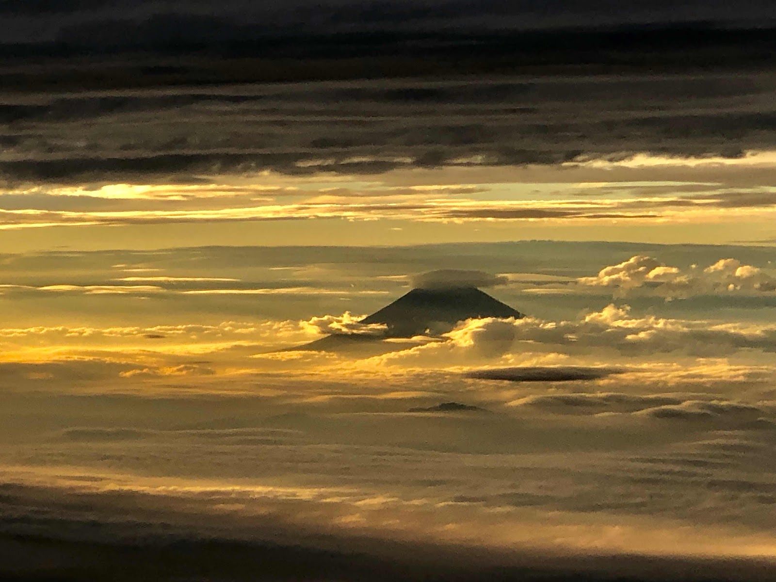 昨夕の天空からの富士山、曇っていましたが隙間から幻想的夕暮れ富士山見ることが出来ました。