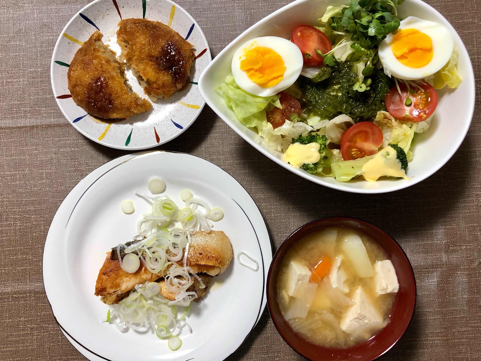 めかぶ野菜サラダ、牛肉たっぷりのコロッケ、オリーブオイル焼鮭、そして糖質ゼロのアルコールでヘルシーディナー美味しく頂きました。