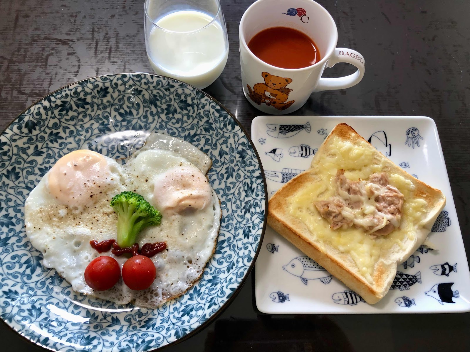 ブランチは、ツナチーズトースト、目玉焼き、野菜ジュース、牛乳🥛美味しく頂きました♪☺️