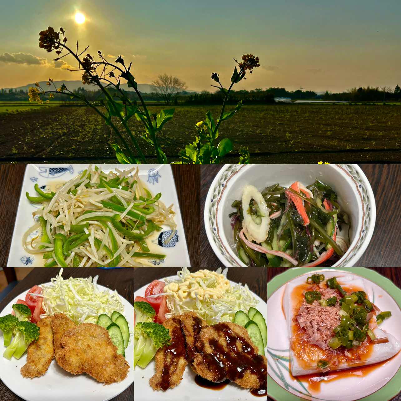 帰宅途中、肝付カントリーからの風景、丁度夕陽と菜の花、いい感じでした。今宵のディナーは🍽️