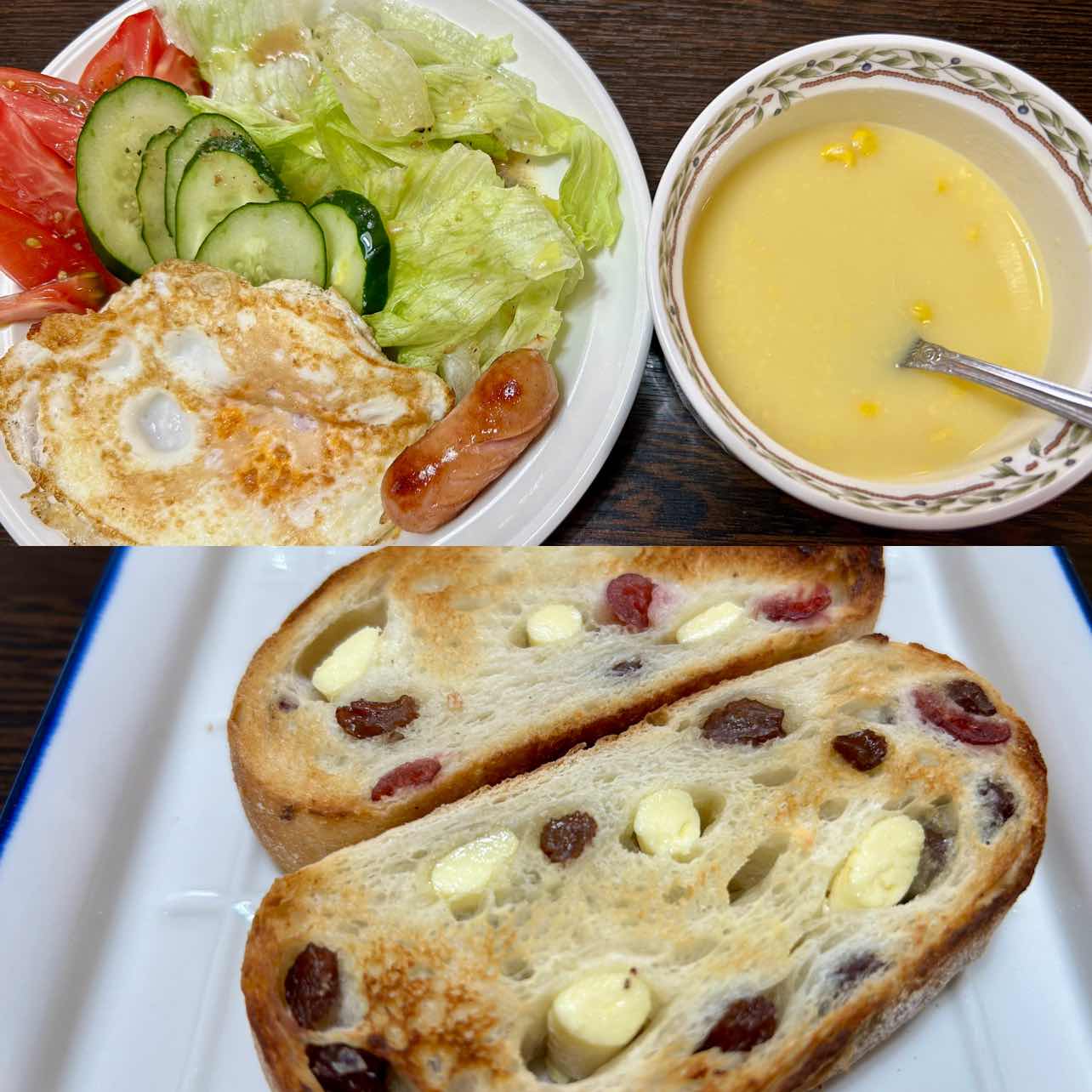 遅めの朝食は酵母チーズレーズンパン、コーンスープ、目玉焼きとサラダ、パンも凄く美味しかったです。