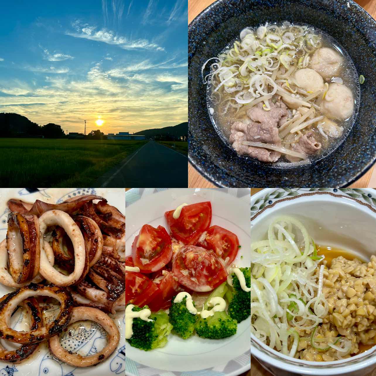 今宵は、肉里芋とイカバター醤油焼き、トマトとブロッコリー温サラダ🥗、ひきわりネギ納豆、冷酒で疲れ癒しました。