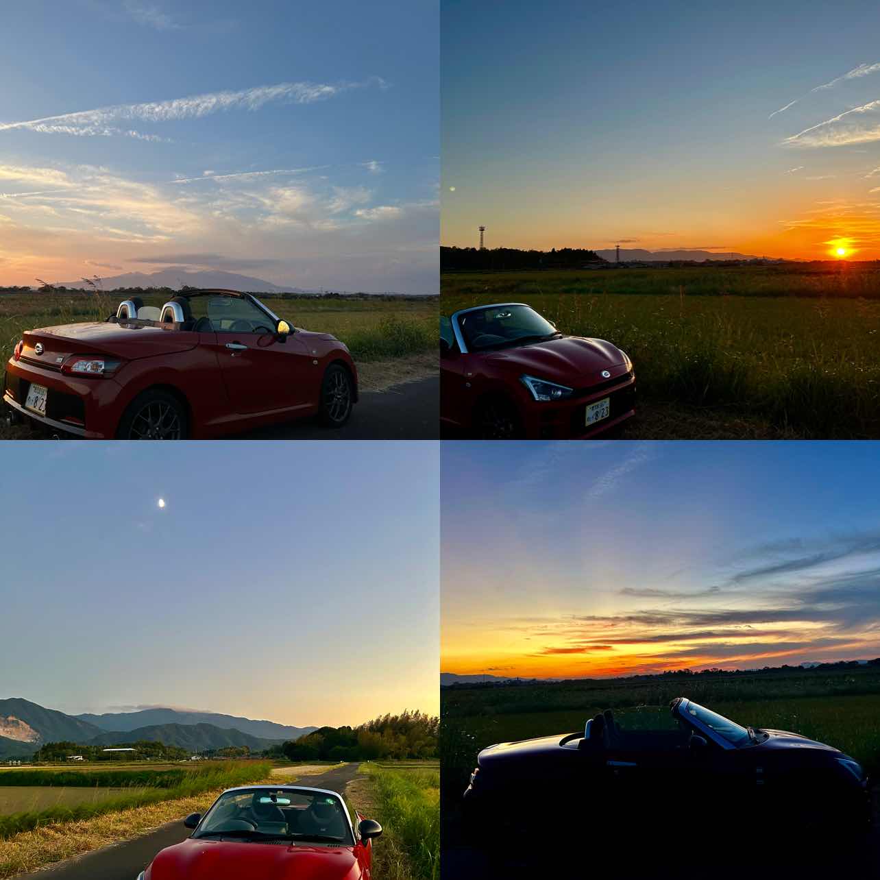 いつもの肝付カントリーの夕暮れウォーキング楽しみました。ちょうど夕陽沈む瞬間、そして夕焼け、夕月