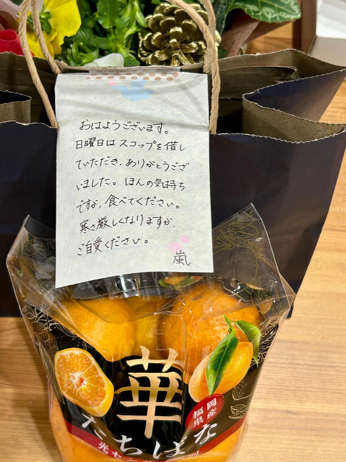 今朝、ドアの外ノブにみかんが掛けられていました。帰宅して中を見たらお礼のメモがありました。日曜日の大雪の際、近所のご夫婦が車で出かけようとしていましたが雪でスリップして動けなくなっていましたのでスコップと雪祓いをお貸ししただけですが・・・