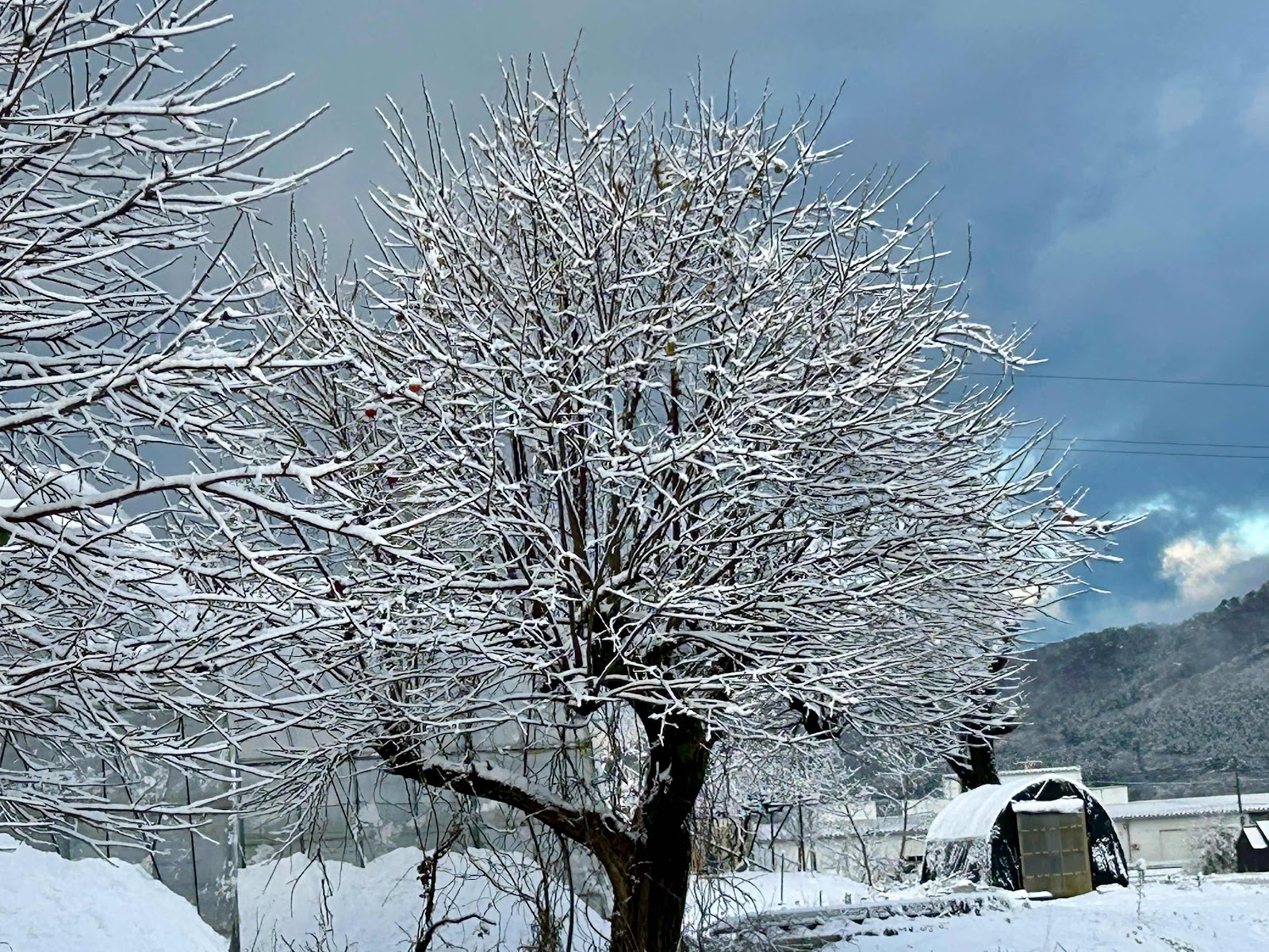 今朝は氷点下、夜に降った雪が凍って、樹木の雪が樹氷の様に綺麗でした。