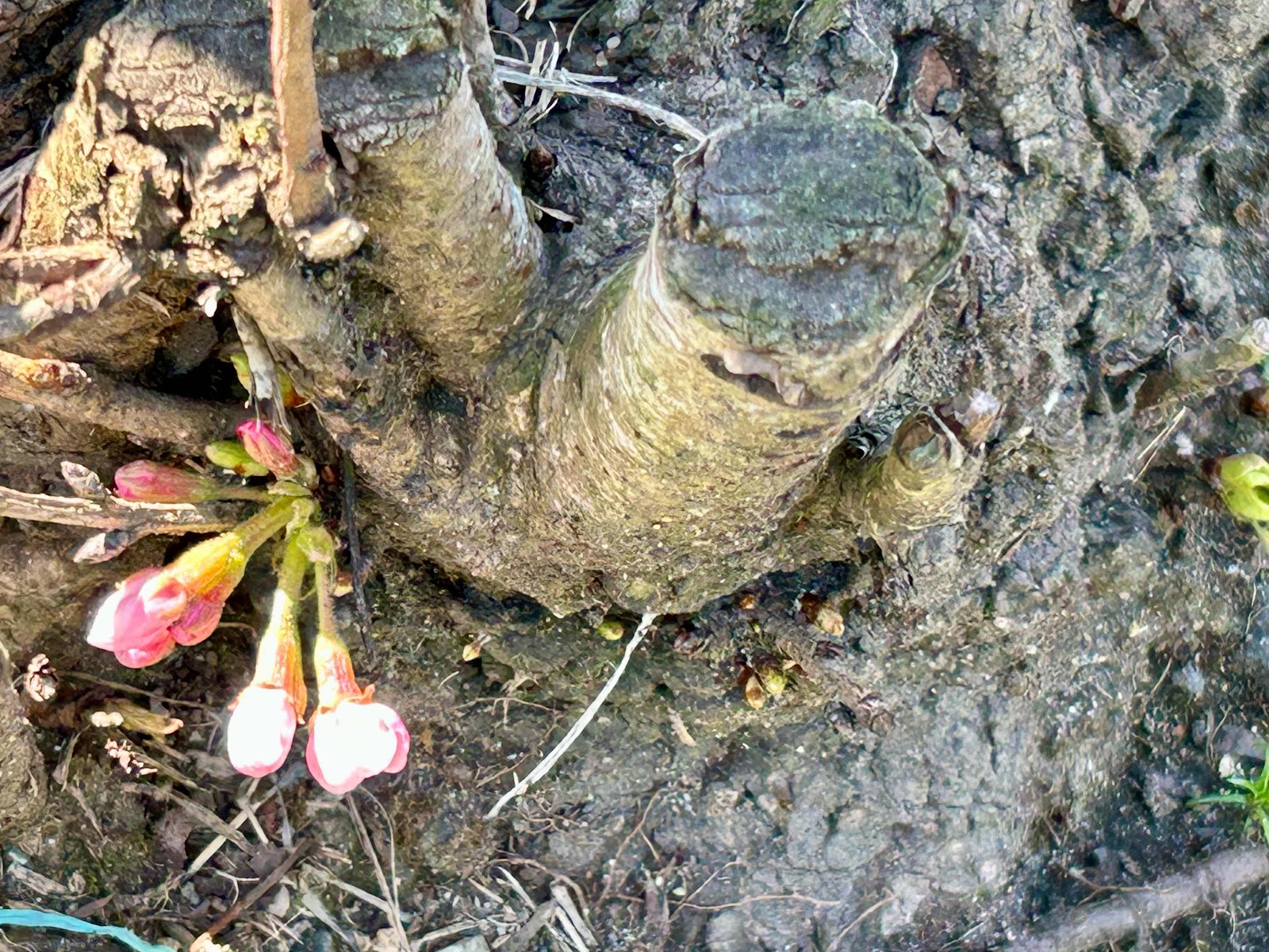 桜の花はまだまだ蕾は硬い様です。ところが根っこに蕾が膨らんで咲きそうです。
