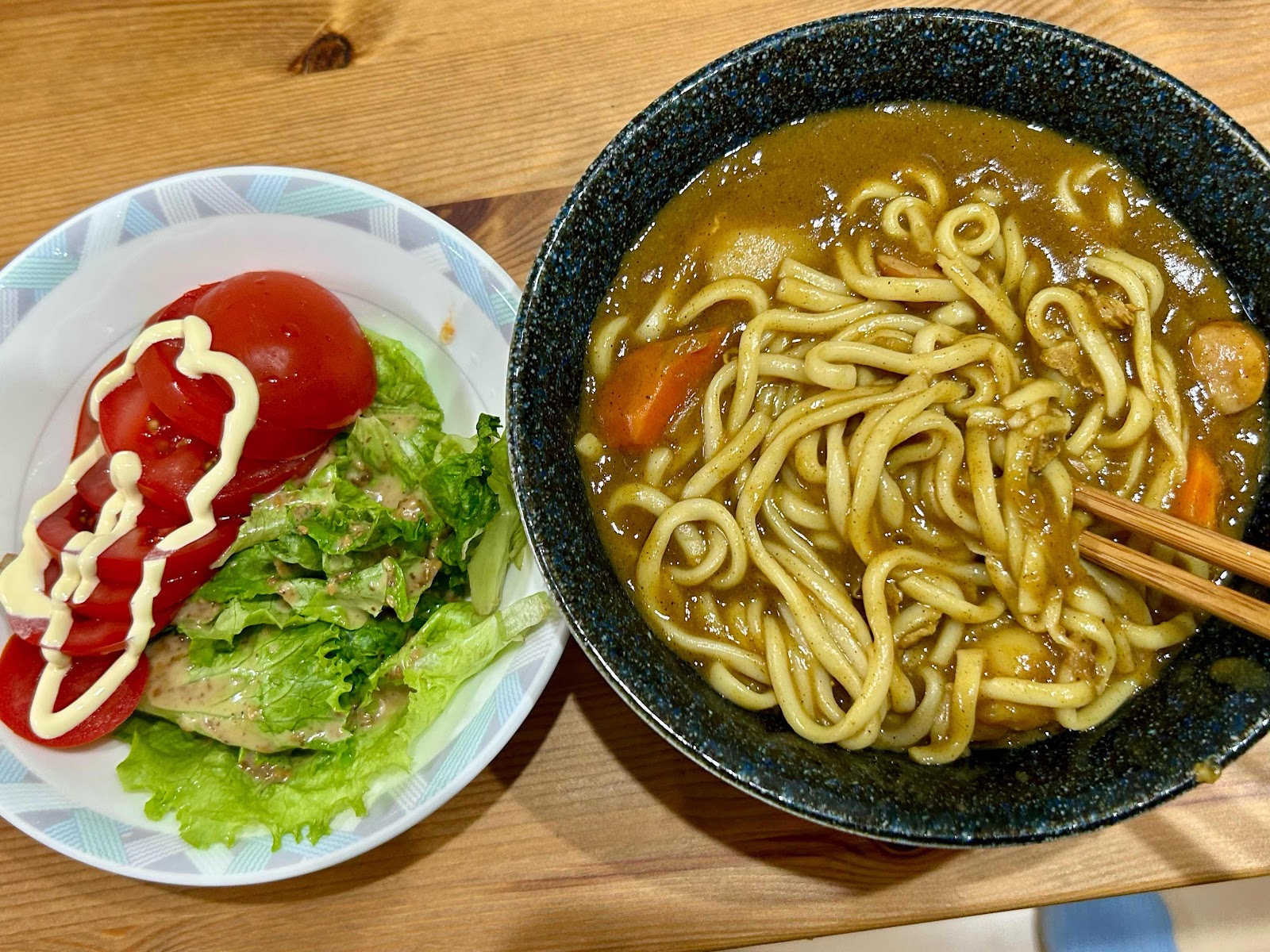 カレーうどん、焼きうどん、豆腐とネギのバター卵とじ(やわらぎメンマ入り)