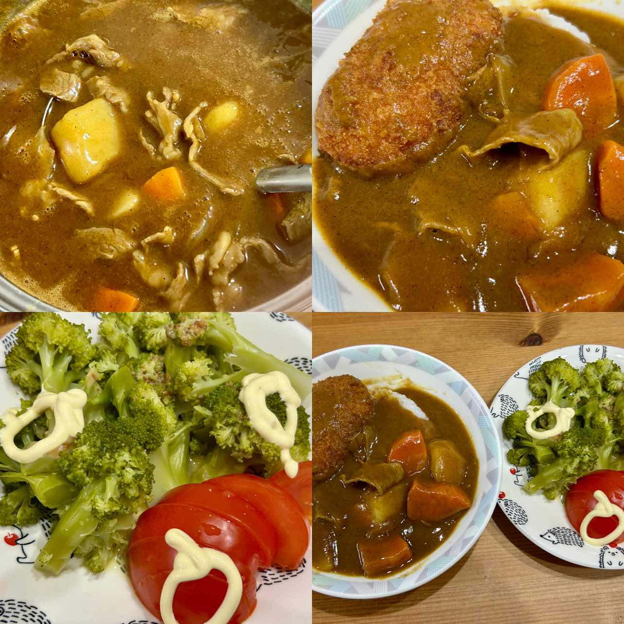 久しぶりに自分料理 ビーフカレーライス作りました。サラダはブロッコリー🥦を買って湯がきましたが茹ですぎ失敗作です。