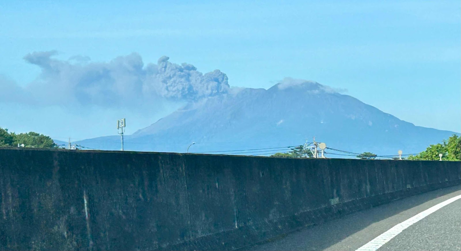 空港からの新燃岳はおとなしい噴煙です。飛行機は無事飛び立ちました。